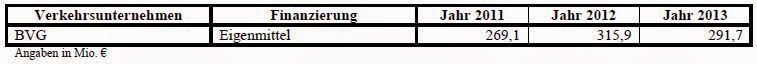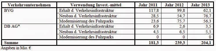 Frage 5: Wofür haben die BVG A.ö.R., die S-Bahn Berlin GmbH und die DB AG in den Jahren 2011 bis 2014 die erhaltenen Investitionsmittel verwendet? (Bitte nach Jahren und Verkehrsunternehmen aufschlüsseln.) a. Erhalt der Verkehrsinfrastruktur b. Neubau von Verkehrsinfrastruktur c. Modernisierung des Fuhrparks Antwort zu 5: Die nachfolgende Tabelle gibt eine Übersicht, wofür die Verkehrsunternehmen BVG AöR und DB AG* in den Jahren 2011 bis 2013 die erhaltenen Investitionsmittel verwendet haben.
