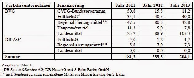 Frage 3: Welche Investitionsmittel haben die BVG A.ö.R., die S-Bahn Berlin GmbH und die DB AG in den Jahren 2011 bis 2014 aus Bundesmitteln (GVFG, Ent-flechtG, Regionalisierungsmittel, Hauptstadtfinanzie-rungsvertrag) erhalten? (Bitte nach Jahren, Herkunft der Mittel und Verkehrsunternehmen aufschlüsseln.) Frage 4: Welche Investitionsmittel haben die BVG A.ö.R., die S-Bahn Berlin GmbH und die DB AG in den Jahren 2011 bis 2014 aus Landesmitteln erhalten? (Bitte nach Jahren, Herkunft der Mittel und Verkehrsunterneh-men aufschlüsseln.) Antwort zu 3 und 4: Das Land Berlin erhält vom Bund Kompensationszahlungen nach dem Entflechtungsgesetz, Zuweisungen nach dem Regionalisierungsgesetz, Zuwei-sungen für Maßnahmen nach dem GVFG-Bundespro-gramm und dem Hauptstadtfinanzierungsvertrag. Ergän-zend hierzu werden Landesmittel bereitgestellt. Diese Finanzmittel werden im Einklang mit den politischen Zielen und gemäß den Vorgaben der Haushaltsgesetzge-bung durch den Senat an die BVG AöR und die DB AG zugewendet. Darüber hinaus erhält die DB AG weitere Finanzmit-tel des Bundes direkt, wie z.B. für DB-Vorhaben aus dem GVFG1-Bundesprogramm, dem Bedarfsplan sowie gemäß Leistungs- und Finanzierungsvereinbarung, über die der Senat keine Kenntnis hat. Die nachfolgende Tabelle gibt eine Übersicht, in wel-chem Umfang die Verkehrsunternehmen BVG AöR und DB AG* in den Jahren 2011 bis 2013 Bundes- und Lan-desmittel für Investitionen erhielten. Für 2014 konnten aufgrund des noch nicht abgeschlossenen Haushaltsjahres noch keine Angaben gemacht werden.
