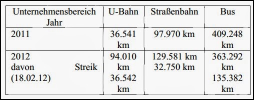 Gemäß der Berichterstattung der BVG AöR an das Center Nahverkehr Berlin (CNB) wurden für die Jahre 2011 und 2012 insgesamt folgende Leistungsmengen als ausgefallen und damit nicht abrechenbar gemeldet: